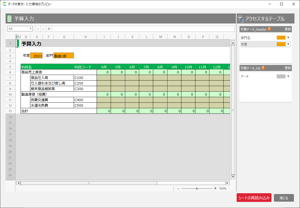 - プレビュー画面で、データを入力・参照するセルがExcelと同じであることを確認します。サンプルでは「E3」、「G3」、「I7:T9」、「I11:T12」になります。