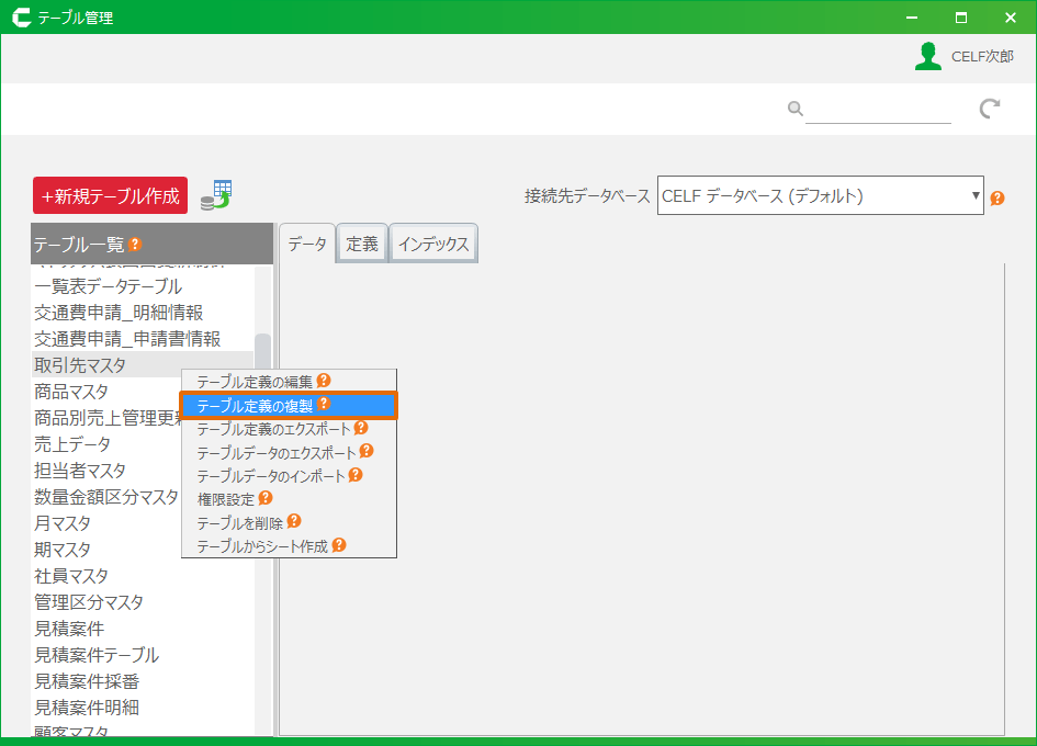 - 「テーブル一覧」から複製するテーブルを右クリックして、「テーブル定義の複製」メニューをクリックします。