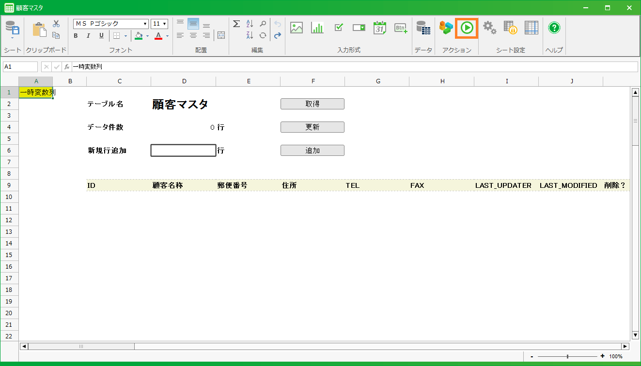 - テスト実行モードでシートが開きます。