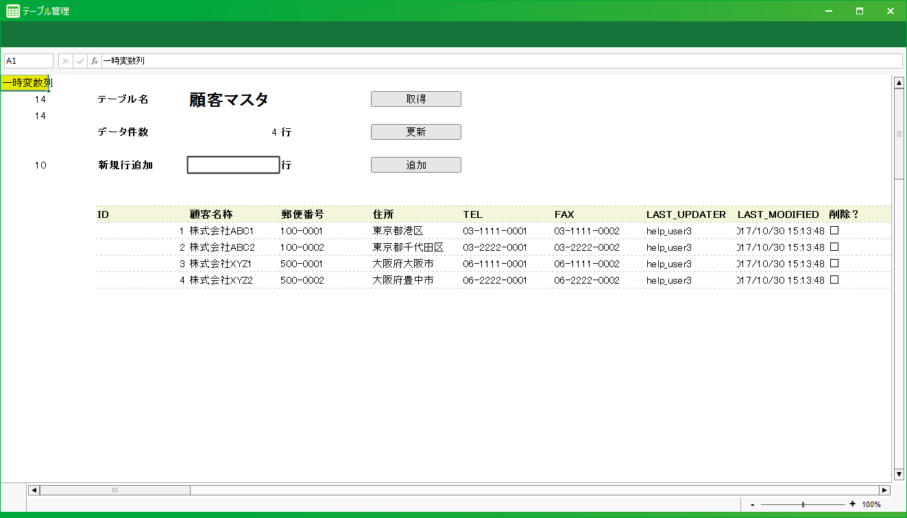 - テスト実行モードでシートを開いた場合、「アプリ公開設定」ダイアログの「テーブル切替え」タブで公開時テーブル切替えを有効にしても公開時切替先テーブルにアクセスは切替りません。公開時に使用するテーブルを切替えて実行する場合は アプリで使用するテーブルを開発時と公開時で切替える を参照してください。