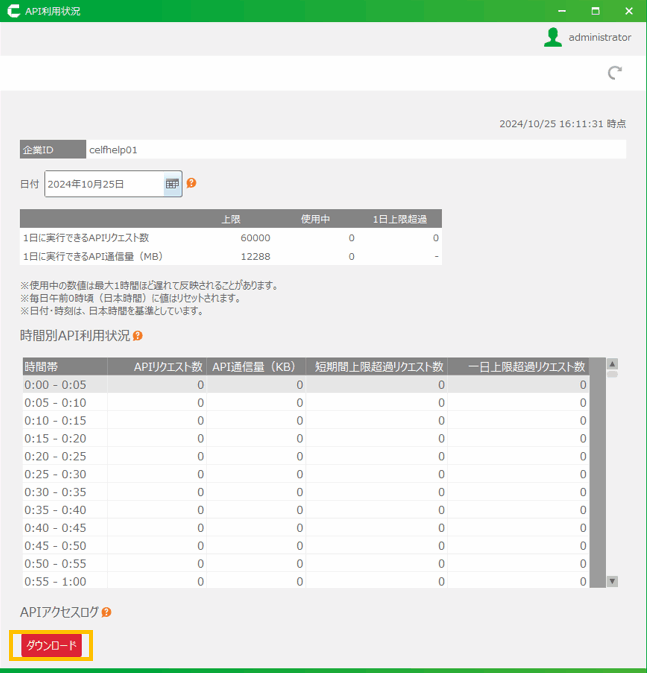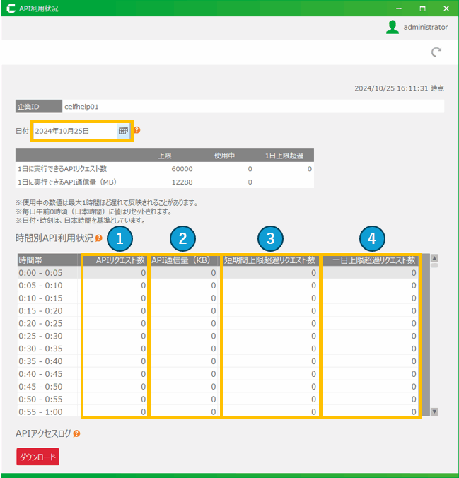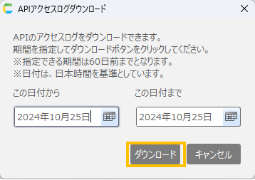 1.「APIアクセスログ」の「ダウンロード」ボタンをクリックし、「APIアクセスログダウンロード」ビューを開きます。